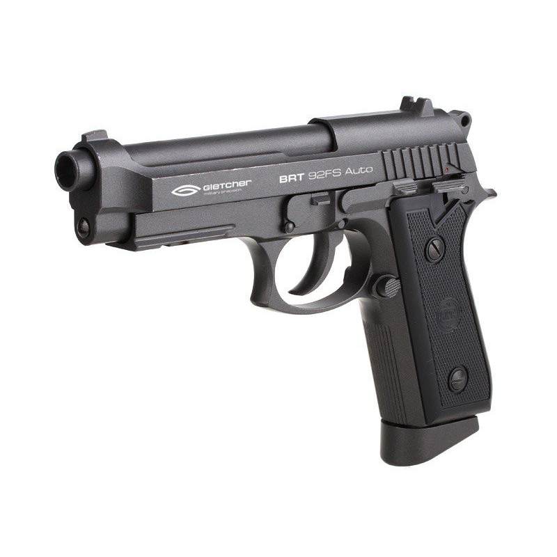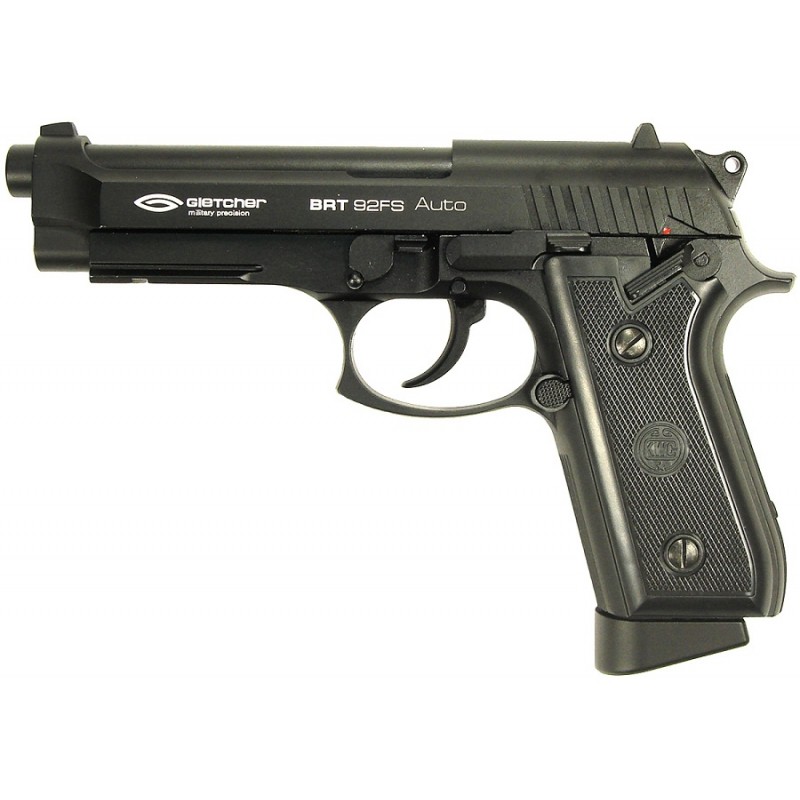 Вес, идентичный натуральному, подвижная затворная рама Blow-Back, взводной курок и затворная задержка имитируют стрельбу из настоящего огнестрельного оружия. Пистолет пневматический Gletcher BRT 92FS: