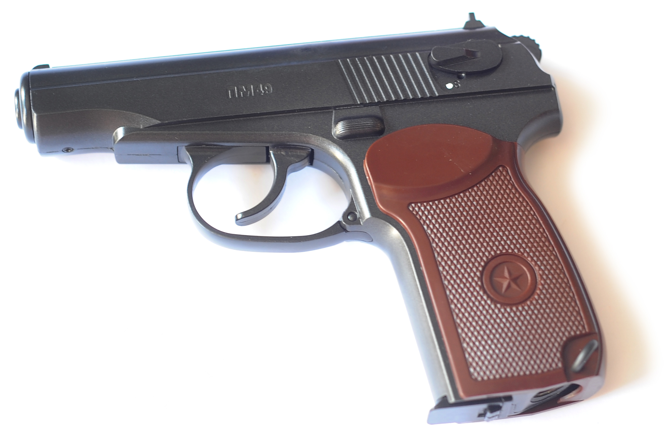 Borner ПМ – это модель пневматического пистолета от нового производителя, который только-только начинает занимать свою нишу на отечественном оружейном рынке. Производственные мощности данного бренда локализуются в Тайване и не исключено, что пневматика Борнер изготавливается на одном заводе наряду с продукцией других брендов. Конкретно эта модель гарантировано моментально заинтересует потребителей. Да и как может быть иначе, если она копирует славно известный пистолет Макарова. Borner ПМ в точности повторяет характерные черты легендарного боевого пистолета вплоть до мельчайших деталей. Отличить копию от оригинала для обычного человека вообще невозможно, а опытным стрелкам разрешить эту задачу, во всяком случае, будет не очень легко. Внешние данные пистолета действительно заслуживают самых лестных похвал, однако, это вовсе не достижение производителя, ведь над дизайном Макарова работали совсем другие инженеры. Как бы там ни было, а специалисты компании Борнер также потрудились проработать тщательнейшим образов копию ПМ, но только уже с технической стороны. Сделать копию дизайна не слишком сложно, а вот наделить такую пневматику хорошими техническими качествами куда сложнее. Однако можно сделать смелый вывод, что разработчики Borner ПМ с этой задачей справились как минимум хорошо. Пневматика может похвастаться завидной мощностью и точностью, которая, к сожалению, имеет хорошие показатели лишь на небольших дистанциях. Хотя пистолет ведь предназначен именно для стрельбы на коротких дистанциях, а для игры в снайпера лучше присмотреть себе винтовку. Скорость выстрела из борнер ПМ составляет не меньше ста пятнадцати метров за секунду, но на практике оружие показывает более высокие результаты. Такой скорострельности с головой хватает для обеспечения комфортной и увлекательной развлекательной и спортивной стрельбы. Емкость магазина пневматической копии пистолета-легенды Макарова довольно велика и составляет ровно семнадцать пуль. Для стрельбы из данной модели не подойдут обычные 4.5 миллиметровые свинцовые пули, а лишь стальные шарики-бебешки с медным напылением.