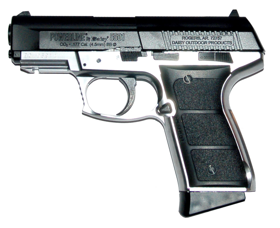 Описание: Пневматический полуавтоматический газобаллоный пистолет фирмы Daisy модель 5501. Пистолет изготовлен из металлических сплавов, рамка при этом никелирована. Это весьма положительно сказывается на его долговечности и прочности. Система Blowback имитирует движение затвора боевого оружия. Пистолет снабжен ручным предохранителем, блокирующим спусковой крючок. Прицельные приспособления – открытая мушка и прицельная планка. В качестве источника энергии применяются 12-ти граммовые баллончики с углекислотой (СО2). Боеприпасами являются стальные омедненные шарики калибра 4,5 мм. Пистолет оснащен приспособлениями для дополнительного оборудования. Уникальная запатентованная система поддержания давления позволит вам тренироваться в стрельбе в течение долгого времени. Пистолет является, пожалуй, самым оптимальным выбором по соотношению цена/качество для развлекательной стрельбы. Продукция изготовлена в Японии по заказу фирмы Daisy. Технические характеристики: