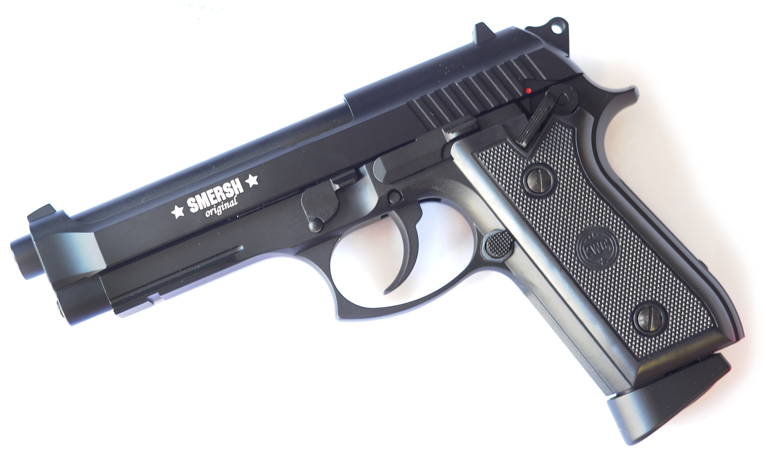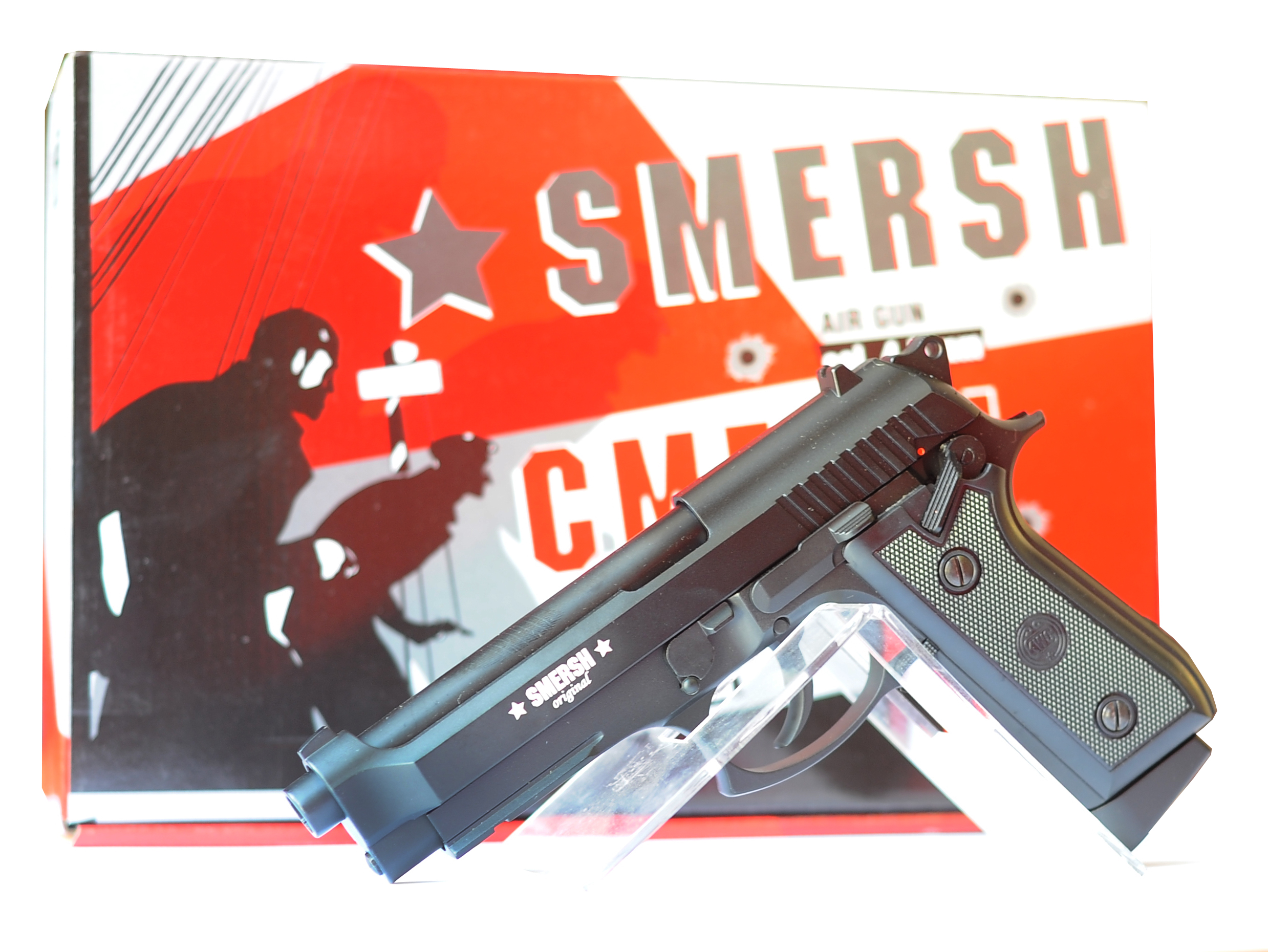 Smersh H 62 - газобалонная копия бразильского пистолета Taurus, берущего корни из благородной итальянской семьи Beretta. Основное отличие от Беретты модели 92 или М9 - это расположение предохранителя, у данного пистолета предохранитель не на затворе, а на рамке, и по функционалу похож предохранитель пистолета Кольт 1911. Smersh H 62 полностью из металлического сплава, за исключением нескольких деталей. Пистолет обладает ощутимым блоубэком, отлично лежит в руке и хорошо сбалансирован.