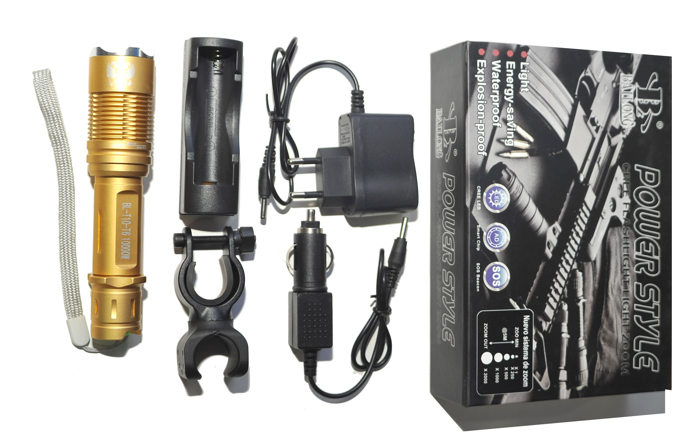 Комплектация: x1 - Светодиодный фонарик Bailong BL-T10-T6 x1 - АКБ (4200 mAh, 3.7 V) x1 - Ремешок (наручный) x1 - Адаптер питания (сетевой) x1 - Адаптер питания (автомобильный) x1 - Крепеж для руля (велосипедного)