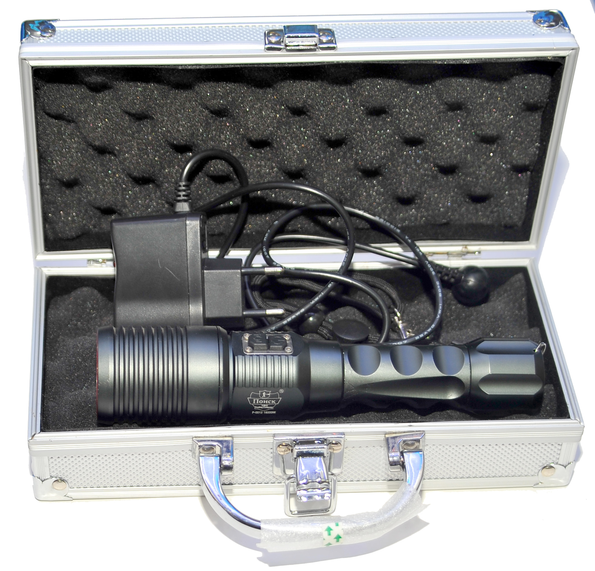 Комплектация: x1 - Светодиодный фонарик Поиск P-0012 x1 - АКБ ( 4800 mAh, 3.7 V) x1 - Ремешок (наручный) x1 - Адаптер питания (сетевой) x1 - Металлический бокс