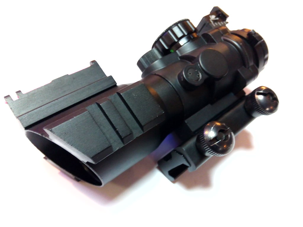 Оригинальная конструкция прицела совмещает в себе 4-кратный загонник с открытыми прицельными приспособлениями, что позволяет стрелять на близкие и средние дистанции практически не меняя вкладку. Планки Пикатинни позволяют смонтировать дополнительные устройства (фонари, ЛЦУ). |