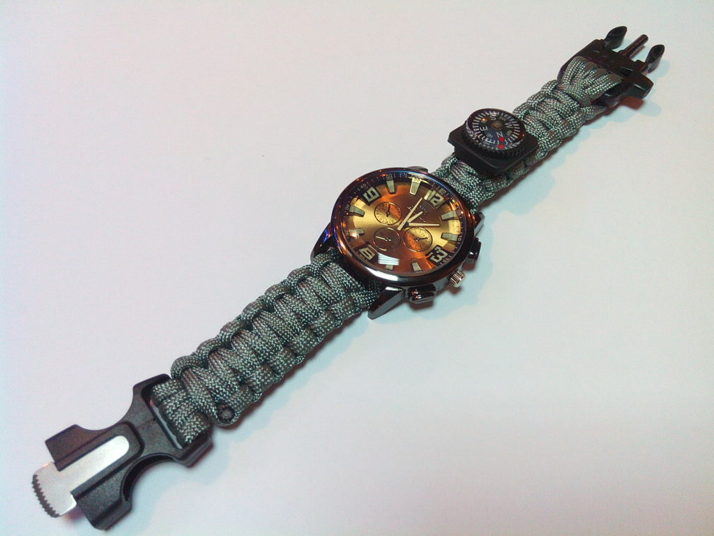 Часы идут с браслетом из паракорда, который называют ремешком выживания, так как он дает возможность мужчине держать при себе паракорд длиной 3,6 метров, на разрыв которого понадобится усилие не менее 226 кг. Имеет при себе миниатюрный компас и огниво. |